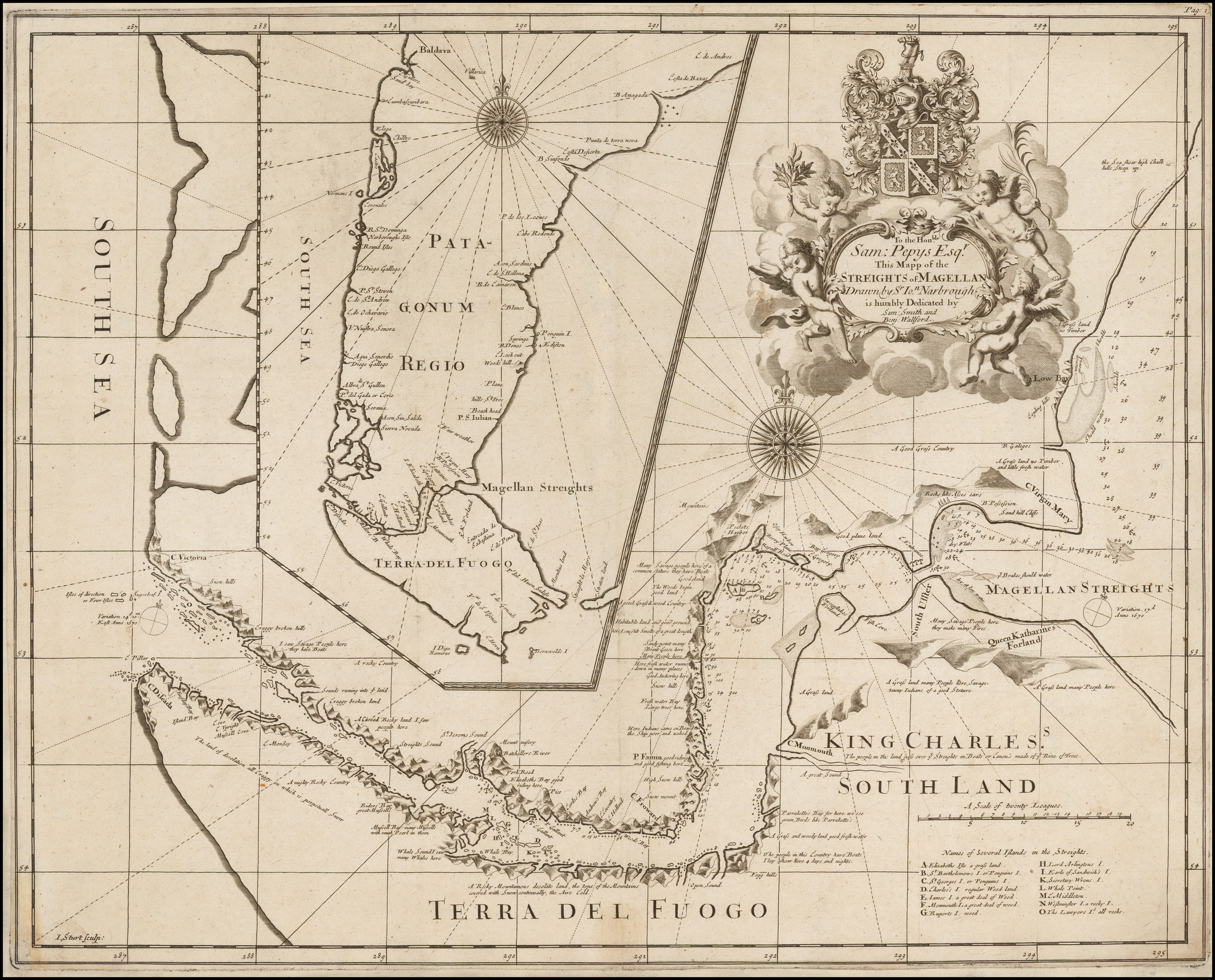 - Imagen: Mapa del estrecho de Magallanes elaborado por John Narborough tras su viaje: Map of the Streights of Magellan Drawn by Sr. John Narborough 1694 – https://storage.googleapis.com/raremaps/img/xlarge/50399.jpg https://www.raremaps.com/gallery/detail/50399/to-the-honble-sam-pepys-esqr-this-mapp-of-the-streights-o-narborough
